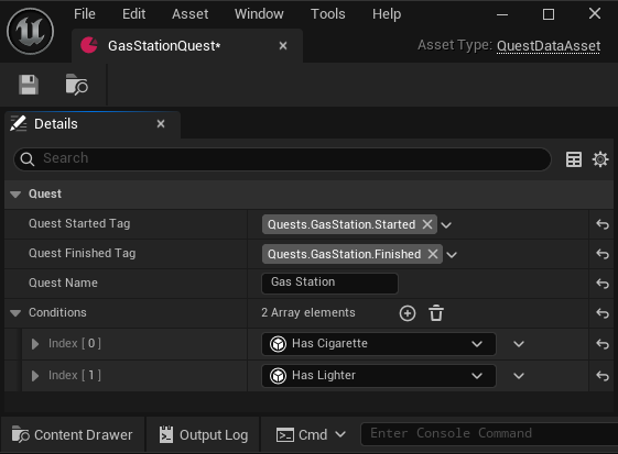 For the world to react to Quest Progression a ProgressionSubsystem was also made which keeps track of globally triggered gameplay tags. These are set along with each quest and its respective conditions and updated whenever a quest is started and finished.